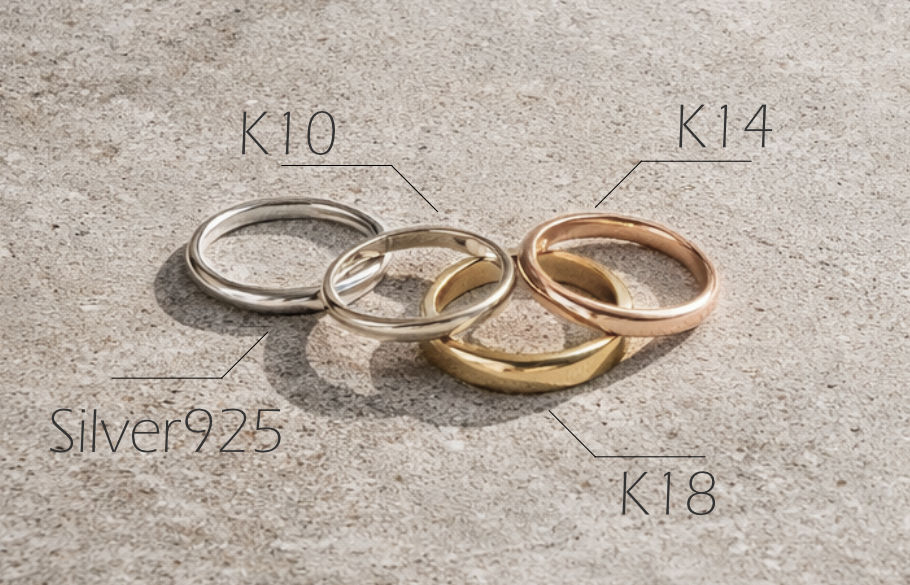 K10やK14は、K18に比べて金の含有量が少ないため、価格を抑えながらも上品な輝きを楽しめる素材です。